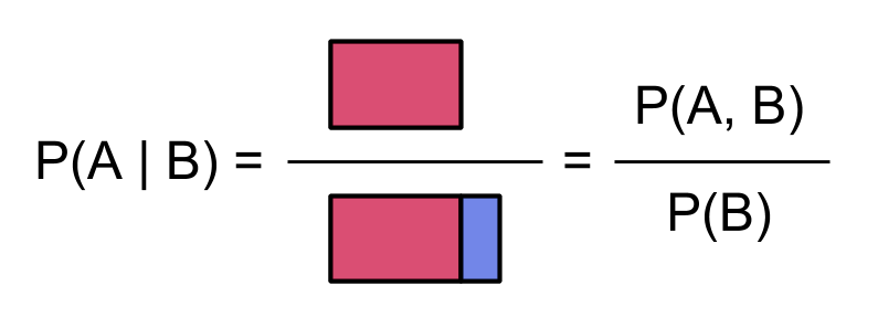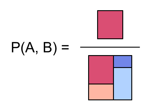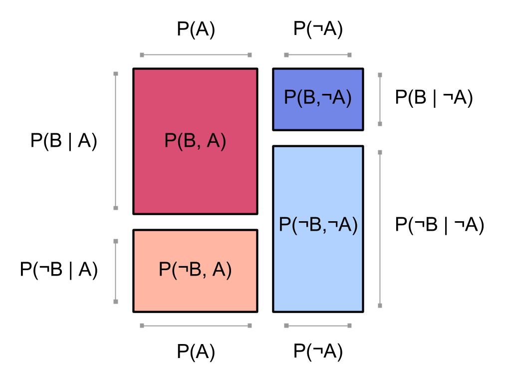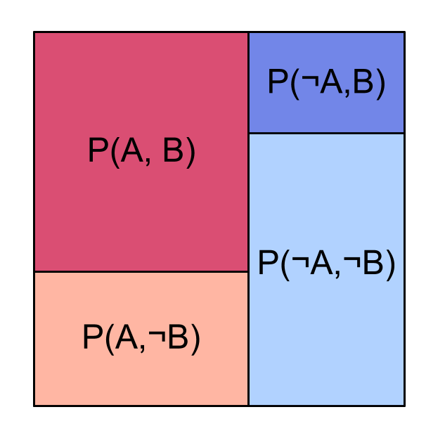 Notice that in the above square, the reddish blocks for \(\bP(A,B)\) and \(\bP(A,\neg B)\) are the same width and form a column; and likewise the blueish blocks for \(\bP(\neg A,B)\) and \(\bP(\neg A,\neg B)\). This is because we chose to factor our probability distribution starting with \(A\):