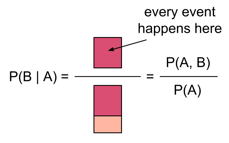 The first factor \(\bP(A = t_A)\) tells us how wide to make the red column \((\bP(A = \true))\) relative to the blue column \((\bP(A = \false))\). Then the second factor \(\bP( B= t_B \mid A= t_A)\) tells us the proportions of dark \((B = \true)\) and light \((B = \false)\) within the column for \(A = t_A\).