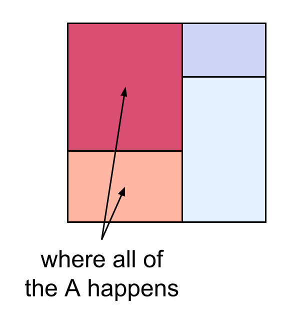 conditional probabilities (Can we find in the square the probability \(\bP(B \mid A)\) of \(B\) if we condition on seeing \(A\)? What about the conditional probability \(\bP(A \mid B)\)?)